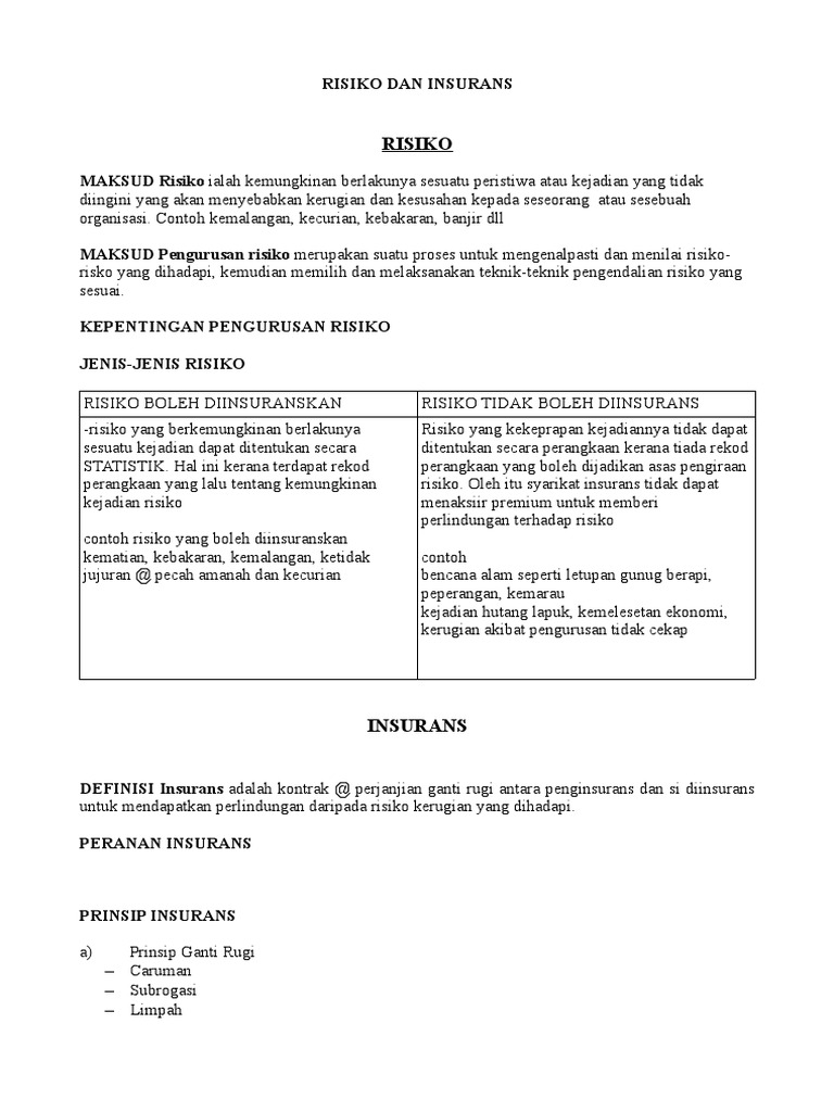 Pembelian polisi insuran bagi risiko yang telah diputuskan untuk dipindahkan kepada syarikat insuran mengelak semua risiko yang boleh dielak tanpa mengorbankan matlamat entity. Request PDF Pengurusan risiko insurans Buku ini mendedahkan pengetahuan tentang pengurusan risiko dan insurans dan jenis-jenis insurans yang terdapat dalam pasaran. Up to 3 cash back RISIKO DAN INSURANS.